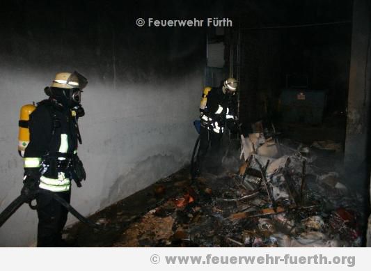 Nach Eintreffen der Feuerwehr ging ein Trupp unter schwerem Atemschutz mit dem CAFS-Schnellangriff des LF 40/1 zum Brandobjekt, mehreren abgestellten Möbelstücken, vor und begann mit den Löscharbeiten. Zur gleichen Zeit wurden die noch im Gebäude verbliebenen Bewohner aus dem 5-stöckigen Wohnhaus evakuiert. Währenddessen rüstete sich ein weiterer Trupp mit schwerem Atemschutz aus und stellte sich in Bereitstellung.