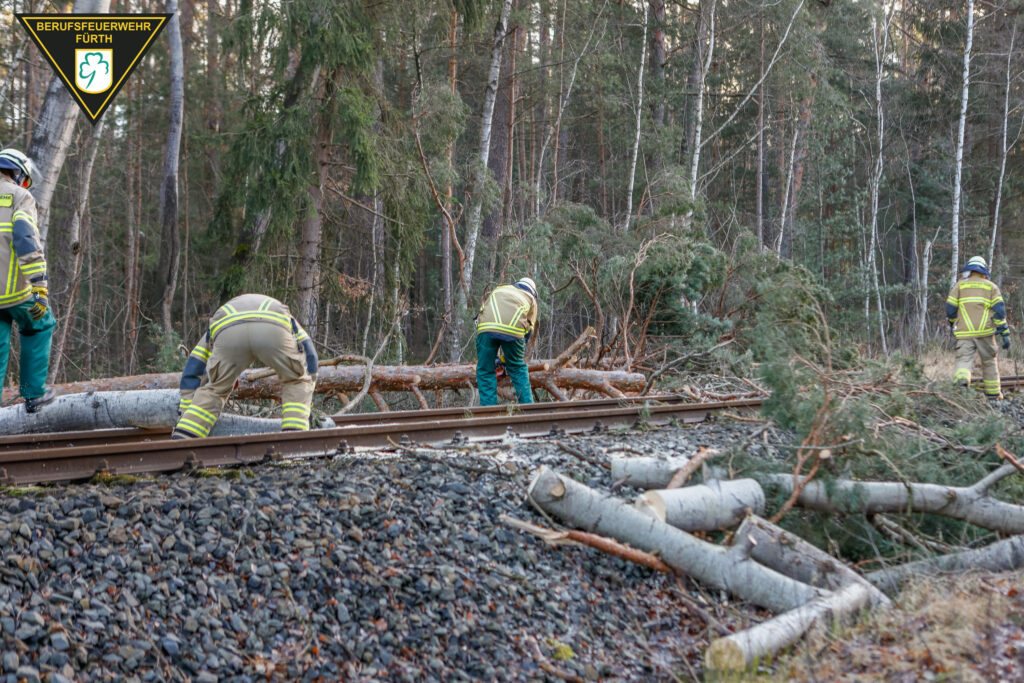 Besonders betroffen vom Sturmereignis war die Bahnstrecke Cadolzburg- Fürth. Bereits in den frühen Morgenstunden war ein Zug bei Bahnkilometer 9,5 auf einen Baum aufgefahren, der umgestürzt auf den Gleisen lag. Die Strecke wurde gesperrt und die Fahrgäste mussten ihre Fahrt mit Ersatzbussen fortsetzen. Zusammen mit den Einsatzkräften der Berufsfeuerwehr Fürth, die zwei weitere auf den Gleisen liegende und zwei umsturzgefährdete Bäume beseitigten waren bei diesem Einsatz auch die Freiwilligen Feuerwehren Cadolzburg und Wachendorf mit Einsatzschwerpunkt Triebwagen vor Ort. Nach bisheriger Kenntnis wurde bei diesem Einsatz und auch bei den übrigen Schadenereignissen niemand verletzt.