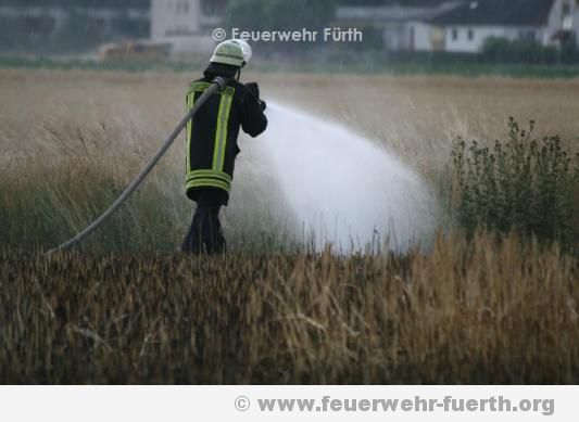 Beim Eintreffen der Feuerwehr war eine starke Rauchentwicklung und Feuer ca. 500 Meter von der Straße aus entfernt im Feld zu sehen. Die Berufsfeuerwehr Fürth fuhr mit dem Tanklöschfahrzeug TLF 24/48 und den beiden Löschfahrzeugen 40/1 und 40/2 in Richtung des Feuers. Die Freiwillige Feuerwehr Burgfarrnbach und ein Teil der Berufsfeuerwehr bauten die B-Leitung für die Wasserversorgung der Fahrzeuge auf. Während dessen wurden 5 C-Rohre vorgenommen, um die beiden Brandstellen auf dem teilweise abgeernteten Feld abzulöschen. Etwa 3500 m² des Feldes brannten ab. Nachdem das Feuer gelöscht war, folgten Nachlöscharbeiten und nach gut einer halben Stunde rückten die Einheiten wieder ein.
