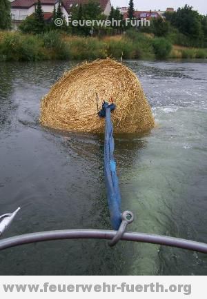 Dort trieb ein großer Stroh-Rundballen in der Mitte des Fahrwassers. Zur Bergung des Ballens wurde die Freiwillige Feuerwehr Burgfarrnbach mit ihrem Mehrzweckboot hinzugezogen.