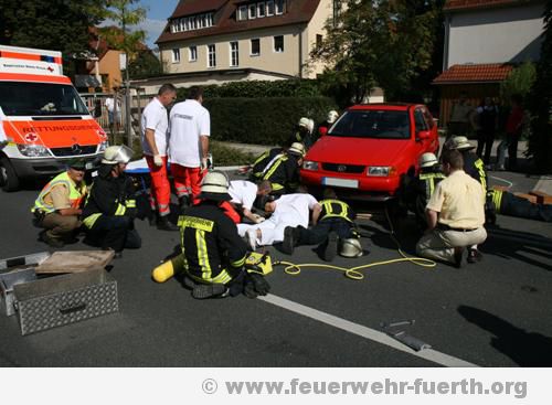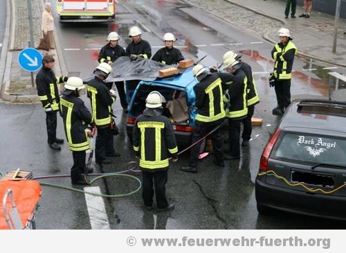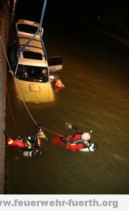 Somit rüsteten sich Feuerwehrtaucher schon während der Anfahrt aus. Gleich nach dem Eintreffen gingen die Taucher von der Kaimauer aus ins Wasser und durchsuchten das Auto nach Personen. Der Fahrer des Autos konnte sich jedoch schon vor Eintreffen der Einheiten aus eigener Kraft retten und wurde mit leichten Unterkühlungen und einem Schock an den Rettungsdienst übergeben. Es befanden sich keine weiteren Insassen im Auto. Zeitgleich wurde die Zirndorfer Brücke einseitig für den Verkehr gesperrt, um die Einsatzstelle von oben mit Hilfe der Drehleiter auszuleuchten. Ebenfalls wurde die Straße „Am Europakanal“ gesperrt. Zusätzlich wurde das Schifffahrtsamt sowie die Wasserschutzpolizei benachrichtigt, um eine Sperrung des Kanals für die Schifffahrt durchzuführen. Um den PKW leichter zu finden, befestigten die Taucher eine Boje an dem Auto. Da das Austreten von Kraftstoff befürchtet wurde, wurden die Freiwilligen Feuerwehren Unterfarrnbach und Burgfarrnbach alarmiert. Diese brachten das Mehrzweckboot MZB90 sowie die Tauchwandsperre und das Ölwehrgerät in Bereitstellung. Der Plan zur Bergung des Fahrzeuges sah vor, mit Hilfe der Seilwinde des Rüstwagens den PKW an die Kaimauer zu ziehen und anschließend mit dem LKW-Kran herauszuheben. Um den PKW an die Kaimauer zu ziehen, wurde dieser mit Hilfe einer Endlosschlinge am Stahlseil der Seilwinde des Rüstwagens befestigt. Langsam wurde der PKW über den Untergrund an die Kaimauer gezogen. Anschließend musste der Ausleger des LKW-Krans ausgefahren werden und mit einer weiteren Endlosschlinge am PKW befestigt werden. Danach wurde der PKW leicht angehoben und gedreht. Die Arbeit der Rettungstaucher der Feuerwehr wurde durch Dunkelheit sowie Sichtweiten unter Wasser von ca. 30 cm erschwert. Somit konnten die Taucher die Arbeiten am PKW nur durch Tasten erledigen. Nachdem der PKW parallel zur Kaimauer stand wurde versucht, ihn langsam aus dem Wasser zu heben. Der PKW wurde von der Berufsfeuerwehr zu mehr als der Hälfte aus dem Wasser gehoben und dort gesichert. Um den PKW ganz aus dem Wasser zu heben, wurde das Technische Hilfswerk alarmiert, das mit einem Auto-Kran anrückte. Nach dem Eintreffen des THWs wurde der PKW von Kran der Berufsfeuerwehr Fürth an den Auto-Kran des THWs umgehängt und vollständig aus dem Wasser gezogen.