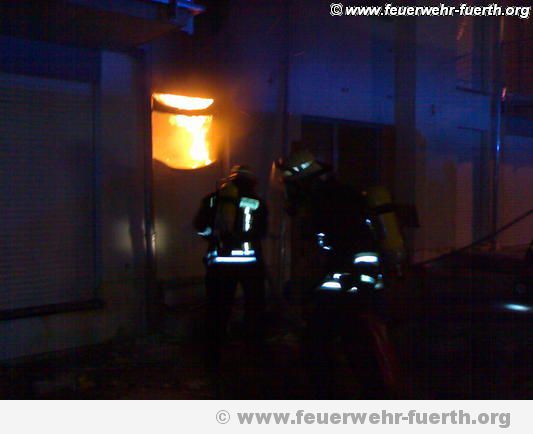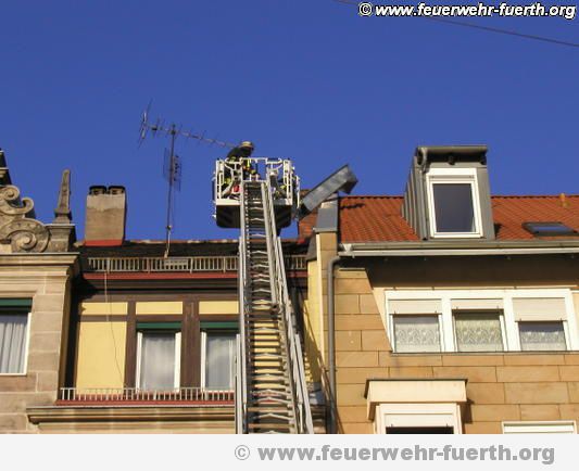 Dort brannte es in einem Raum unter dem Dach. Ein Trupp der Berufsfeuerwehr ging mit einem Rohr durch das Haus zum Brandherd vor, ein weiterer wurde von der Drehleiter aus am Dach eingesetzt. Das Dach musste großflächig abgedeckt werden. Die Brandmauer verhinderte ein Übergreifen auf das Nachbarhaus.