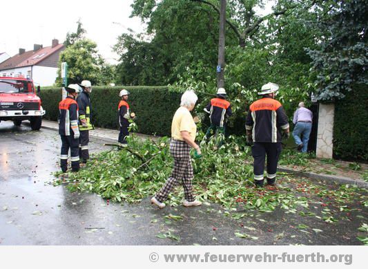 Kurz nach 14 Uhr zog eine Unwetterfront mit starkem Regen und Hagelkörnern von bis zu ca. 3 cm Größe durch das Fürther Stadtgebiet. Darauf mussten die Berufsfeuerwehr sowie die Freiwilligen Feuerwehren Fürths zu mehreren Einsätzen ausrücken. Es werden im Folgenden nur wenige ausgewählte Einsätze aufgeführt, da die Feuerwehr mehr als 50 Einsätze zu bewältigen hatte.