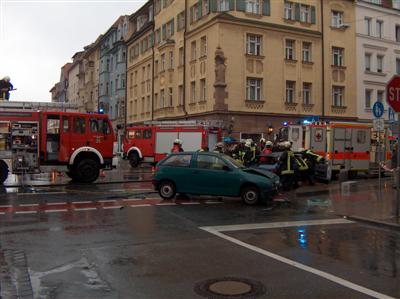 Kurz nach 17 Uhr wurde die Berufsfeuerwehr zu einem Verkehrsunfall in die Flößausstraße gerufen. Der Rüstzug der Berufsfeuerwehr mit ELW 10/2, LF 40/1 und RW2 61/1 rückten aus der Wache am Helmplatz aus. Zeitgleich fuhren das Löschfahrzeug LF 40/2 und Drehleiter 30/2 von der Nebenwache, die während der Fürther Kirchweih eingerichtet ist, an. Beim Eintreffen an der Einsatzstelle war eine Person schon aus dem PKW befreit. Eine weitere Person musste von der Feuerwehr nach Absprache mit dem Rettungsdienst befreit werden. Dazu wurde das Fahrzeugdach mit Rettungsschere und -spreizer entfernt. Dann konnte die Person schonend aus dem Fahrzeug gehoben und an den Rettungsdienst übergeben werden. Anschließend wurde die Kreuzung von Splittern und Scherben gesäubert.