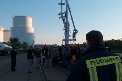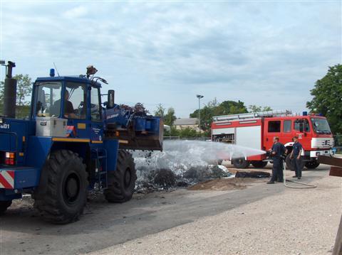 Kurz nach 15 Uhr wurde die Berufsfeuerwehr zum 13. Mal an die Einsatzstelle Leyherstraße gerufen. Bei der am 5. Mai 2005 ausgebrannten Lagerhalle wurden neue Glutnester in dem von der Feuerwehr ins Freie gebrachten Brandgut entdeckt. In den Stoffballen schwelte die Glut weiter und konnte bisher trotz massiven Wassereinsatzes bei den Löscharbeiten nicht ganz gelöscht werden. Somit musste die Berufsfeuerwehr in der letzten Zeit mindestens einmal am Tag zur Einsatzstelle ausrücken, um dort die leicht qualmenden Haufen wiederholt abzulöschen. Heute beschloss der Einsatzleiter des Löschzuges, mit Unterstützung des THW-Radladers die Haufen noch einmal aufzureißen und diese komplett abzulöschen. Beim Öffnen des Haufens war noch immer eine deutliche Wärme spürbar. Mit Hilfe der Wärmebildkamera wurde der Haufen nochmals nach Glutnestern abgesucht.