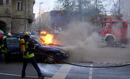 Während der Fahrt geriet in der Königstraße ein PKW in Brand. Der Fahrer konnte das Fahrzeug gerade noch an einer Verkehrsinsel an die Seite lenken. Als die nur wenige hundert Meter entfernte Berufsfeuerwehr eintrifft, schlagen bereits größere Flammen aus dem Motorraum. Der Brand wird von einem Trupp unter PA mit dem Schnellangriff gelöscht.
