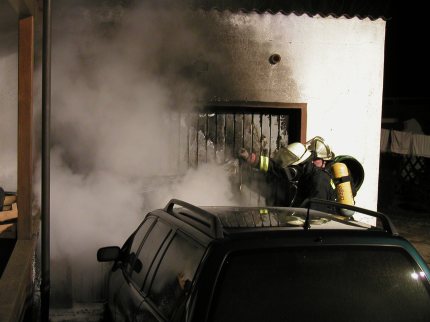 Mit dem Mehrzweckzug wurde der PKW von der Garage weggezogen, so dass diese geöffnet und mit der Wärmebildkamera auf erhitzte Stellen kontrolliert werden konnte.